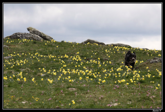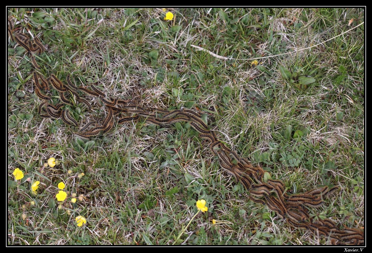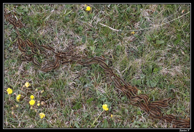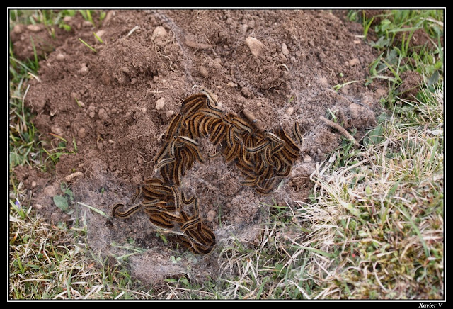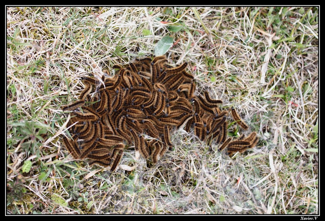 Depuis le hameaux je repars au Sud Est parallèlement à la route et je vais la franchir au niveau du buron de Latreille. Je tombe alors sur de drôles d'amoncellements de chenilles. Heureusement les chiens ne les ont pas vus et ils sont loins devant.