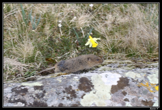 Je reprends mon petit tour ... cent mètres plus loin, alors que je me dirige vers un joli ruisseau, j'entends couiner en direction des chiens. Je les vois s'exciter sur une bestiole ! Je les rejoins en leur beuglant d’arrêter mais leur instinct est tenace. Lorsque j'arrive, un rongeur bien dodu d'une quinzaine de centimètres de long (sans la queue) court dans tous les sens complètement désorienté au milieu des chiens.