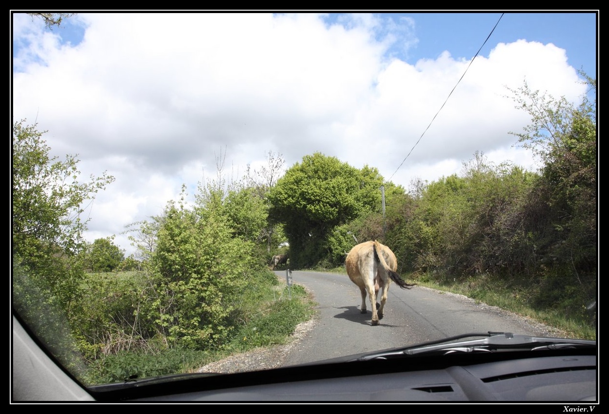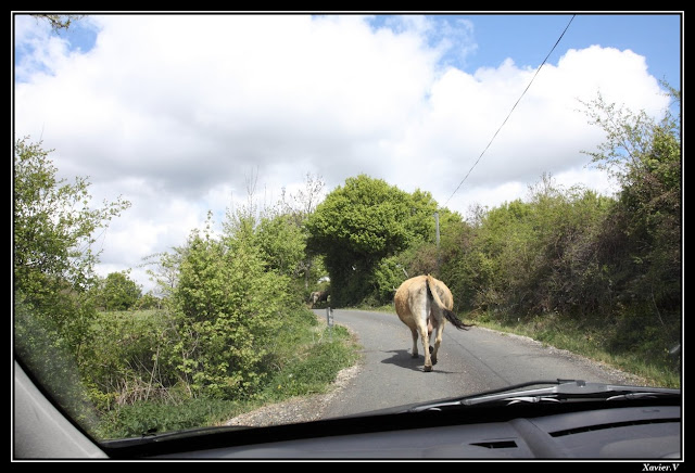 Sur une route de l'Aubrac ... une vache de la race du même nom traîne son popotin tranquillement...
