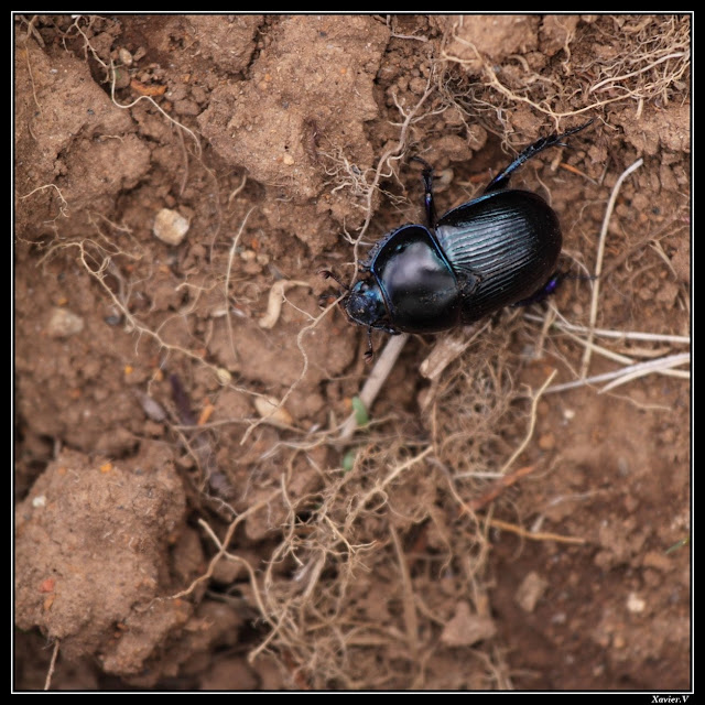 Un bousier qui se promène. C'est leur période à eux aussi, il y en a pleins qui volent partout en vrombissant.