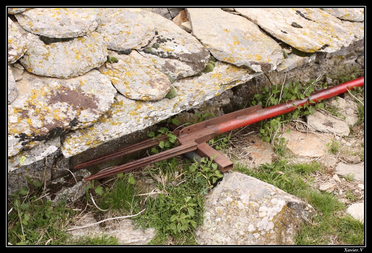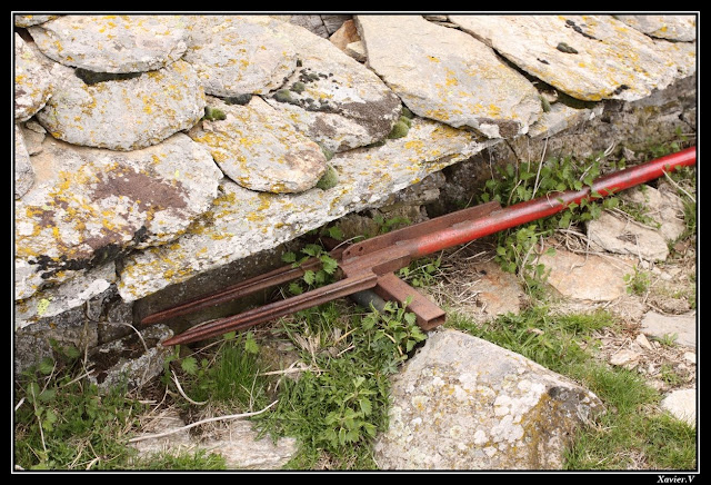 Lors de notre virée dans le Cantal nous avions visité une sorte de musée de la gentiane. On nous avait expliqué qu'on sortait les gentiane du sol avec une énorme fourche étrange. En voici une qui traîne sous la toiture de cet abri.