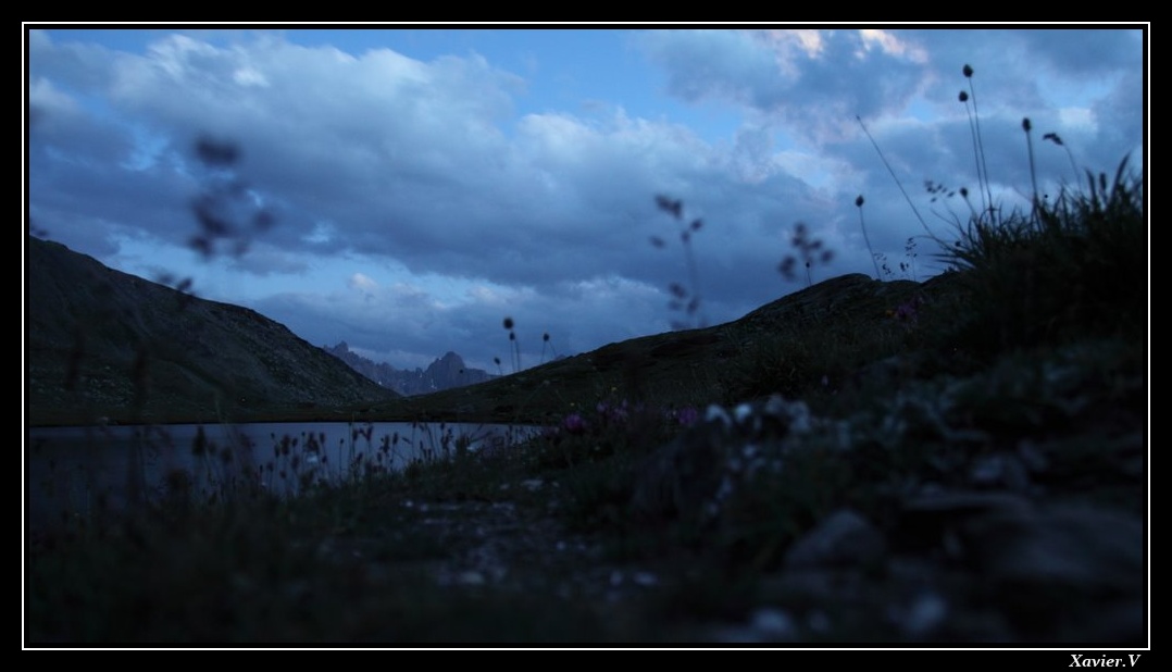 Une petite pause au lac Rond à 18h15 finit de nous achever. Nous plantons la tente... Peu après les premiers éclairs déchirent le ciel. J'ai peur que Dust pique une terreur. Lorsque les éclairs frappent dans notre vallon, nous nous sentons tout petits, tout fatigués et bien stressés... et finalement nous prenons la poudre d'escampette ! Tant pis pour le Galibier et la tentative de deux nuits de suite en bivouac ...