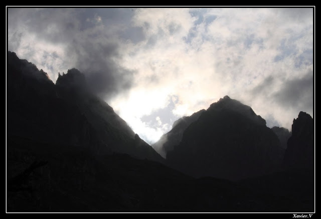 Nous rejoignons le lac de la Cula, pour monter droit vers le pic du lac blanc. Il fait sombre, et il semblerait que nous allons bientôt nous coucher ! Le lieu de bivouac prévu juste sous la cime parait trop dur à atteindre. Nous ne reverrons un vrai sentier qu'au pied du Thabor ...