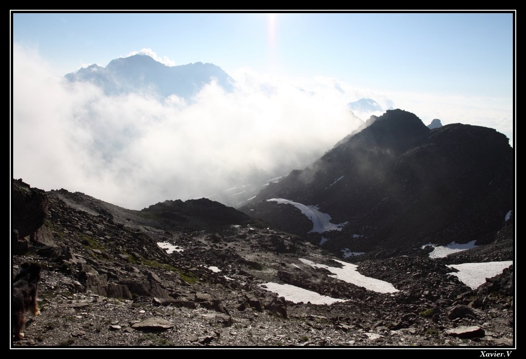 Sans trop s'y attendre, nous avons le droit à un beau nuage agripé à la montagne là où nous voulons passer !