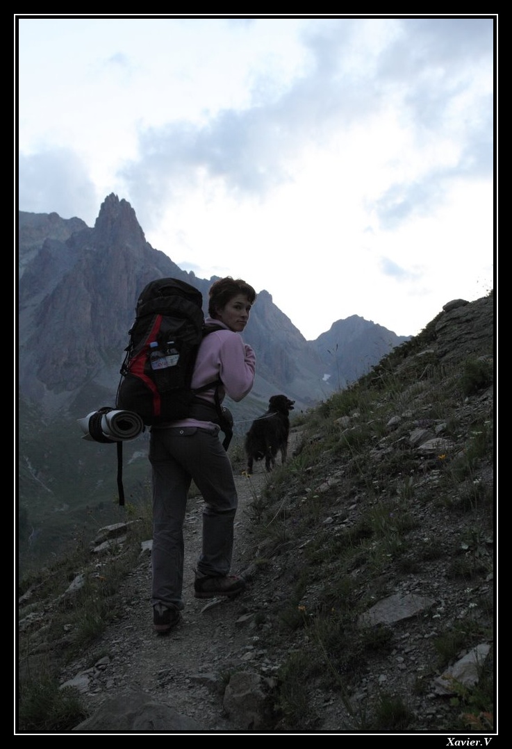 Une petite pause au lac Rond à 18h15 finit de nous achever. Nous plantons la tente... Peu après les premiers éclairs déchirent le ciel. J'ai peur que Dust pique une terreur. Lorsque les éclairs frappent dans notre vallon, nous nous sentons tout petits, tout fatigués et bien stressés... et finalement nous prenons la poudre d'escampette ! Tant pis pour le Galibier et la tentative de deux nuits de suite en bivouac ...